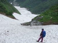 日本三大雪渓のひとつ剣沢雪渓を下ります。雪渓の上部はかなり急で4本歯の軽アイゼンでは危険、夏道も雪渓に覆われていたので、しばらくは地面の出ている急斜面を慎重に下り、ゆるやかな部分から雪渓に入りました。