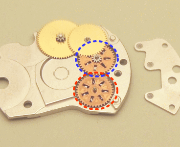 ローターとゼンマイの間の4個の歯車のうち、切り替え車(赤)か伝え車(青)のどちらかの問題かと。これらは、2層式で、上下の歯車は一方向にしか連動しません。片方向は空回りするのです。ここが空回りしないので、巻上げ時に一緒になってローターまで一緒に回転してしまうのでしょう。あくまで想像ですが。