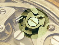 独立輪列方式(ジャガー・ルクルト デュオメトルcal.380)クラッチがない革新的な方式。 クロノグラフ専用のゼンマイと輪列を別に持ち、末端の星型脱進歯車が、時計用の脱進機構と噛み合うことで動き出します。発停レバーで星型脱進歯車を止めると、時計側と噛み合わない絶妙な位置で停止するので、クロノ輪列が止まった状態でも時計は動き続けます。 ・ 発停時のトルク・ロスがない ・ 作動中もテンプ振り角が落ちない(精度が高い) ・ 量産が困難 |