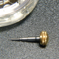 リューズの根元の小さい穴のポッチを細い棒で軽く押すと、リューズを巻き芯ごと抜くことができます。あまり強い力で押すと裏側のパーツが外れてしまうので注意。