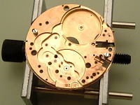 素材は、オークションで200ドル(送料込み)で入手した無名のブランドです。値段どおり、金メッキも剥げ、サビやキズも目立ち、動作も不安定です。なぜか矢印型の分積算計の針が秒針側に付いていてます。しかし、ムーブメントはピラーホイール(コラム・ホイール)を採用したバルジュー社の傑作キャリバー23です。