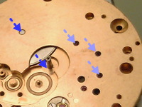 複数の歯車の軸をきちんと穴石に合わせるのは結構難しいです。また、コハゼをずらさないと固定することはできません(黄色い矢印)。