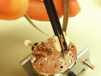 最後に、二番車の裏側にはめ込んであるドライビングピニオンは分車、分針を動かします。これをリムーバーで抜き取ります。
